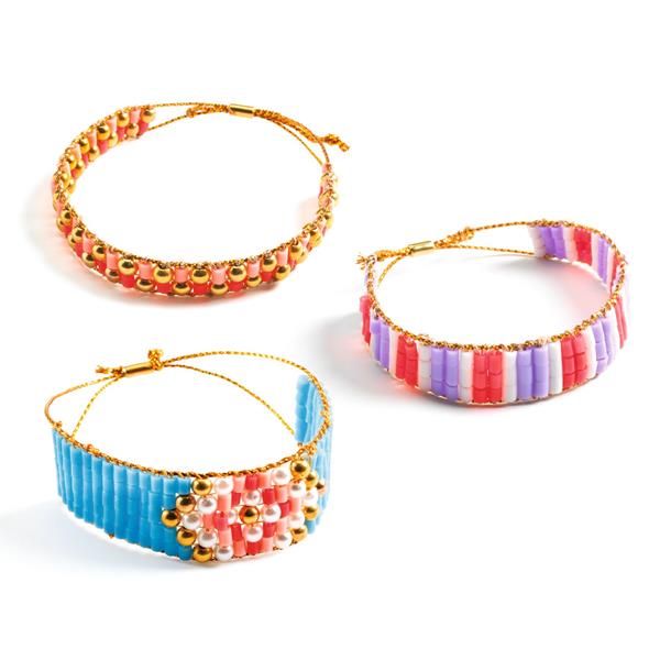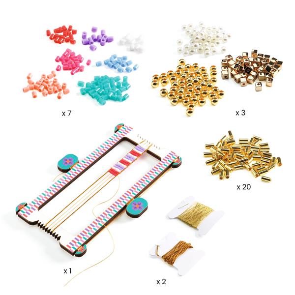 10 types of beads, 1 wooden loom, 2 spools of gold thread and 1 step-by-step instruction booklet.