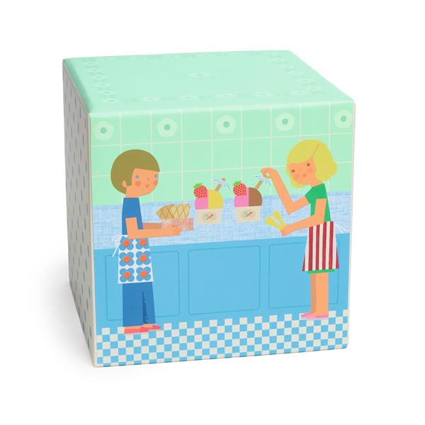 It’s time for an ice-cold treat! With this charming set of wooden and felt accessories, children can prepare delicious colourful ice creams. The child can have fun creating different ice creams, decorating them with the little parasols, adding fruit and biscuit toppings as they please, and serving them to their guests. The box is illustrated with a scene of children happily preparing ice creams, creating a warm family atmosphere.