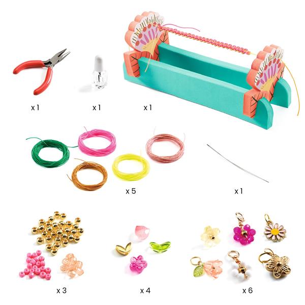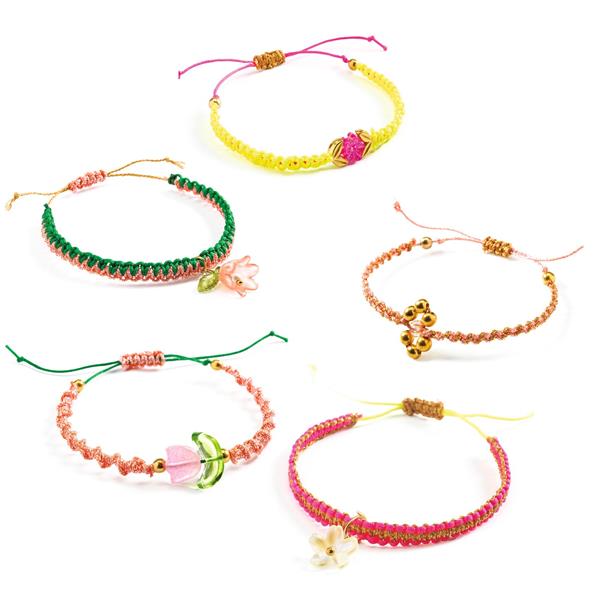 Tout ce qu'il faut pour faire facilement 10 bracelets en macramé et perles. Contenu : 1 aiguille. Un flacon de vernis.1 pince. 6 charms. 7 sortes de perles. 5 couleurs de fil dont 1 doré. 1 outil en mousse. 1 livret explicatif pas à pas.