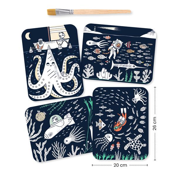4 planches à peindre, un petit pinceau en bois et 1 livret.