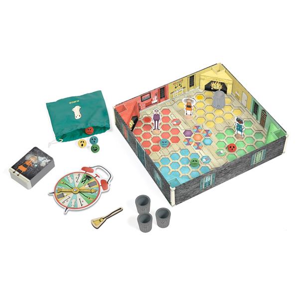 1 boîte = plateau de jeu, 3 pions grands-parents, 1 balais, 8 billes fantôme, 60 cartes défi, 4 poubelles, un sac en tissu, 1 mini plateau horloge. Règle du jeu en 10 langues.