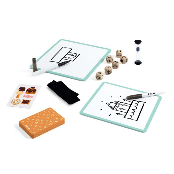 4 ardoises, 4 feutres, 6 dés, 25 cartes thème, 1 sablier. Règle du jeu en 10 langues.