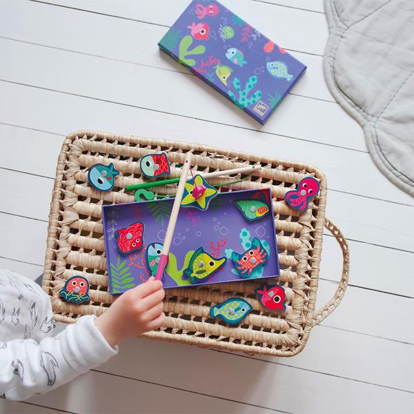 Prêts pour une partie de pêche ? Des animaux de la mer en bois, 2 cannes à pêche et une jolie boîte qui se transforme en fond marin. L'enfant attrape les pièces en bois aimantées à l'aide de la canne. La partie de pêche peut commencer ! Pour les petits pêcheurs à partir de 2 ans.