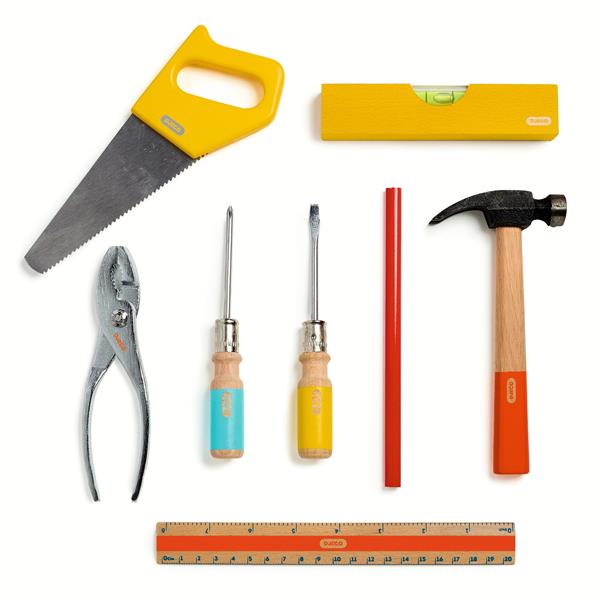 8 pièces : marteau, tournevis plat, tournevis cruciforme, pince, scie, niveau à bulle, règle et crayon de bois.