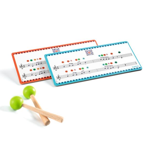 1 tambour en acier de 15 cm de diamètre avec 8 languettes, 2 baguettes en bois (longueur 8,5 cm) avec un embout de 2 cm en caoutchouc, 1 sac de rangement et 2 partitions recto verso en carton (18 x 8,5 x 0,2 cm).