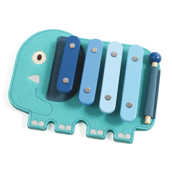 Un xylophone en bois et feutrine en forme d’éléphant, aux couleurs vives et adapté aux petites mains des tout-petits. L’enfant utilise la baguette en bois pour jouer les 4 notes et découvrir ses premières mélodies. La feutrine apporte douceur et volume tout en restant légère, pour un premier instrument à la fois ludique et sensoriel.