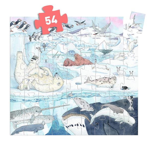 Explorez l’Arctique et laissez-vous bercer par la douceur de ses animaux polaires et de ses paysages glacés. Ce puzzle coloré de 54 pièces est présenté dans une jolie boîte silhouette en forme d'arbre.