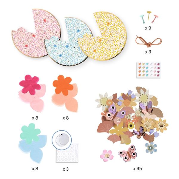 3 chapeaux avec un motif floral différent, 3 jeux de 2 fleurs en papier de soie assorties à assembler avec leurs 6 attaches parisiennes, 3 assortiments de décorations florales en papier à coller, 3 planches de mousses adhésives double-face, 1 planche de fausses perles adhésives, 3 élastiques ronds dorés, 1 notice explicative détaillée pour chaque chapeau.
