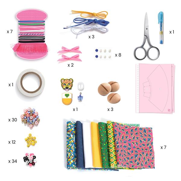 3 poupées, 3 socles en bois, 4 tissus imprimés, 3 tissus de matières variées, 7 galons ou rubans, 3 fils élastiques, 2 patchs brodés autocollants, un sachet de perles et petits accessoires, 1 planche de strass autocollants, 1 paire de ciseaux, 1 rouleau d'adhésif double-face, 1 stylo, 3 planches de patrons.