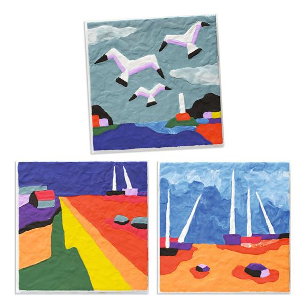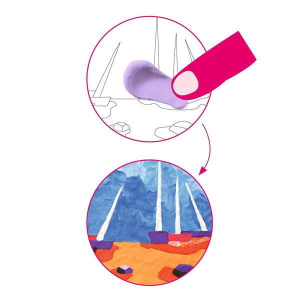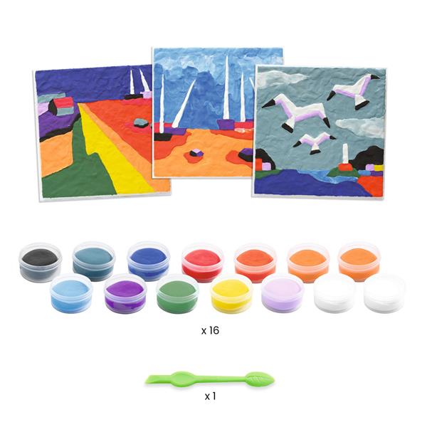 Un coffret qui utilise la pâte à modeler de façon inédite, comme une peinture à doigts qui sculpte la matière. Les pâtes à modeler peuvent s'étaler, se mixer et sèchent à l'air libre. Un hommage au travail de la matière qu'affectionnait De Staël sur 3 tableaux à réaliser.