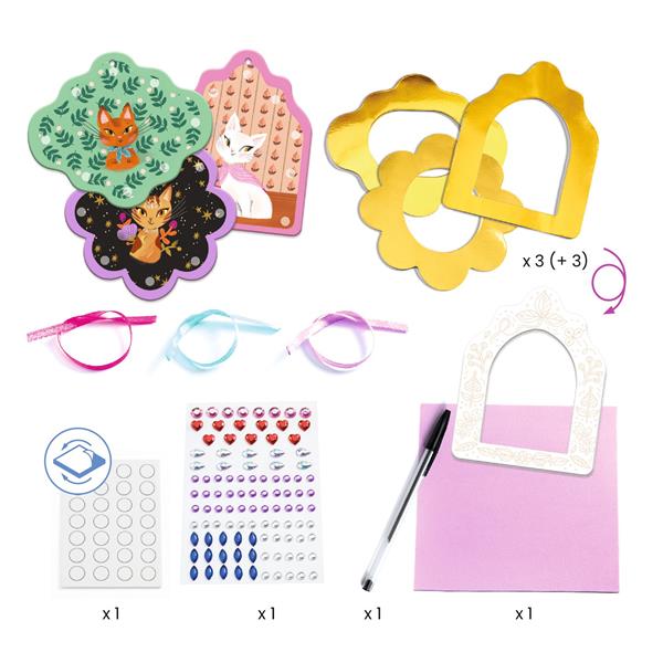 3 portraits de chats à décorer, 3 cadres en métal à repousser et 3 pièces en plus pour s'entraîner à l'activité, 1 plateau en mousse, 1 stylo, 1 planche avec plus de 100 stickers pierres précieuses, 3 rubans satin, 1 planche de mousses adhésives double-face, 1 feuillet d'explications pas-à-pas en couleurs.